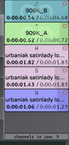 - experiment with playlists: use them as a poor man's sequencer to compose drum patterns or melodies; use 'shuffle' in combination with 'loop' to create interesting randomized sequences; use 'start all simultaneously' to make interesting combinations of sound effects; use 'single key step through' in combination with 'shuffle' to trigger randomly chosen sounds