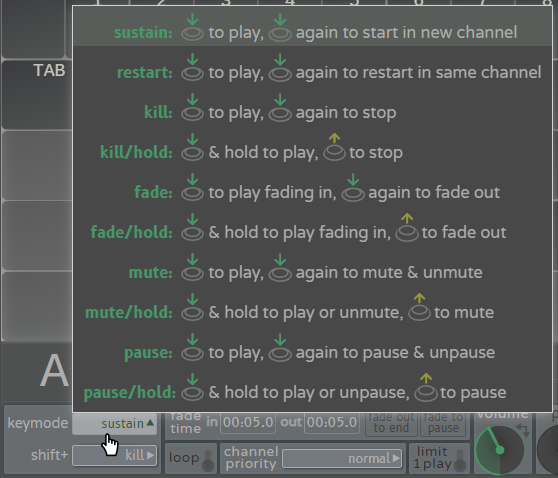 - fade mode enables triggering fade ins and fade outs of the sound. If the sound is not playing, then pressing the key in 'fade' mode causes the sound to start playing from 0% volume and fade in to the currently set key volume over the fade in duration set in the fade time controls; if the sound is already playing, then hitting the key fades out the sound from its current volume to 0% using the set fade out duration and then kills the sound. To adjust fade times, click and drag the time values for in and out in the fade time panel (hold shift while dragging for high precision adjust mode). When a sound is in the process of fading, a fade progress indicator line displays over the sound's representation in the Channels Meter, moving up from bottom to top along with the sound's volume level as the sound fades in, and down from top to bottom as it fades out. 'fade' can be used in conjunction with other keymodes via 'shift+' to start and stop sounds with and without fades as needed for maximum flexibility. For example, with Tab set to 'keymode':'kill' and 'shift+':'fade', hitting Tab will start its sound at full volume, and then Shift+Tab will fade it out. Or, starting the sound with a Shift+Tab will fade it in, and then pressing Tab without Shift will stop the sound immediately. You can also set the fade in or out time to 0 if, for example, you only want a fade out but no fade in, or vice-versa, without needing to use Shift.