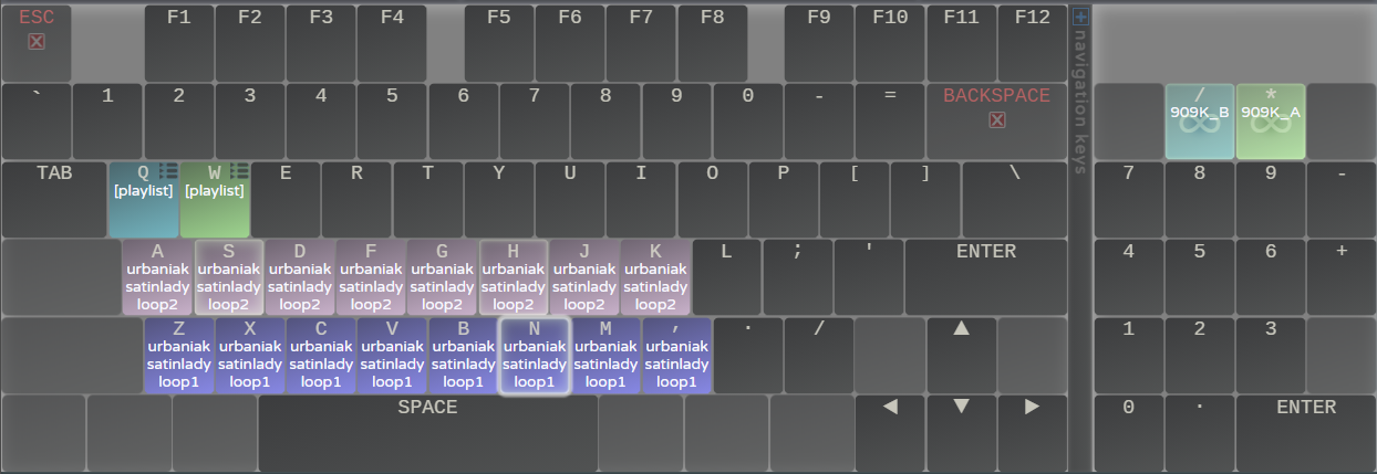 The keyboard display provides an overview of all of the usable keyboard keys and their assigned sound filenames. Each key can be colored and custom-labeled (in the Key Configuration Panel) for ease of reference. Keys show an animated white glow while their assigned sound plays, which gradually lessens in relation to sound playback progress, moving out toward the edges of the key as the sound reaches its end. This glow animation can be turned off under Preferences ➔ interface ➔ animated key glow to force it to display a fixed highlight while playing instead of an animated one. Keys that are queued or paused have a pause icon; keys that are looping have an infinity icon. Keys show a thin yellow border while they are pressed which disappears when released.