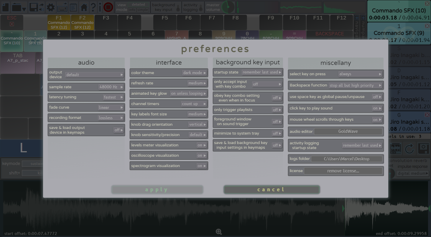 Multiple keys can be selected by holding down Ctrl (Windows) or Command ⌘ (Mac) and single-clicking the desired keys, or Ctrl/⌘+clicking and dragging to select a range of keys, or Shift+clicking to select all keys between the clicked key and the last selected key. This allows for settings to be adjusted in bulk for many keys simultaneously in realtime. Multi-key selection mode can be exited by single clicking any key, or by pressing the Escape key (note: hitting Escape while in multi-key selection mode will not stop any sounds). When in multi-key selection mode, settings that differ between keys will appear blurred out or invisible until they are adjusted to make the settings identical. If the keys selected all have the same sound file assigned then the waveform will display and start and end offsets are bulk-settable; if offset settings differ between keys with the same sound then the differing offset slider will have a contrasting color until clicked to make the settings identical.