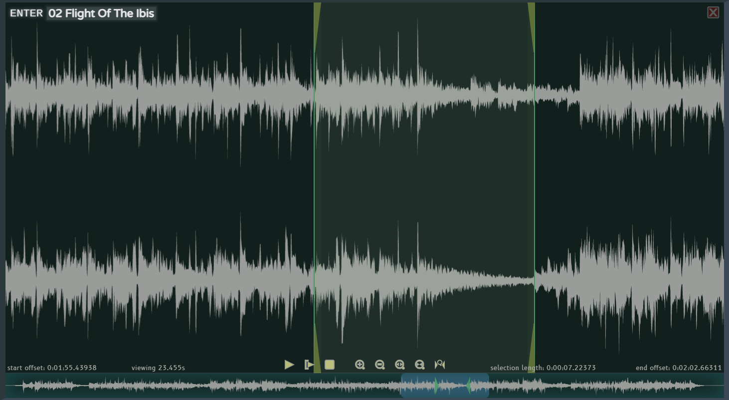The waveform display at bottom shows an overview of the sound's waveform. While the sound is playing, a moving playhead indicates the playback position of the most recent trigger instance of the key, and you can click anywhere along the highlighted part of the waveform to seek the playhead to that point in the sound. The waveform display includes controls for setting the sound's start offset and end offset. This allows limiting the portion of the sound that is played when the key is pressed; use offsets to, for example, trim silence, remove an unwanted song introduction, refine a loop, or extract individual sounds out of a larger track (see the slice multi-key function for a quick automated way to splice portions of a sound across multiple keys). Define start and end points using the left and right sliders, or more precisely by entering zoom view to edit offset points in a full screen zoomable version of the waveform. Offset changes are applied in realtime allowing start and end points to be adjusted while playing the sound, especially handy when adjusting loop points. Along the bottom of the waveform, the start offset and end offset positions are shown; note that these value are relative to the duration of the sound at its default normal speed and won't reflect any speed changes made with pitch shift. ▰ Double click the waveform to reset the offset selection back to the entire length of the sound.