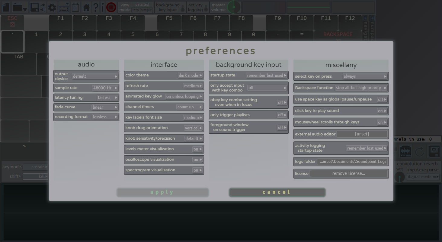 Clicking the preferences button on the Global Function Toolbar opens the Preferences panel for customizing Soundplant's behavior. The 1st time Soundplant is launched, it will search for existing preferences from older versions of Soundplant going back to version 50.0.8 and import them if found, otherwise it will use factory default preferences. ▰ Soundplant stores separate Preferences for every user on a multi-user computer, so if you log in as a different user and run Soundplant, you will have a different set of Preferences. Keys can still trigger sounds while the Preferences panel is open.